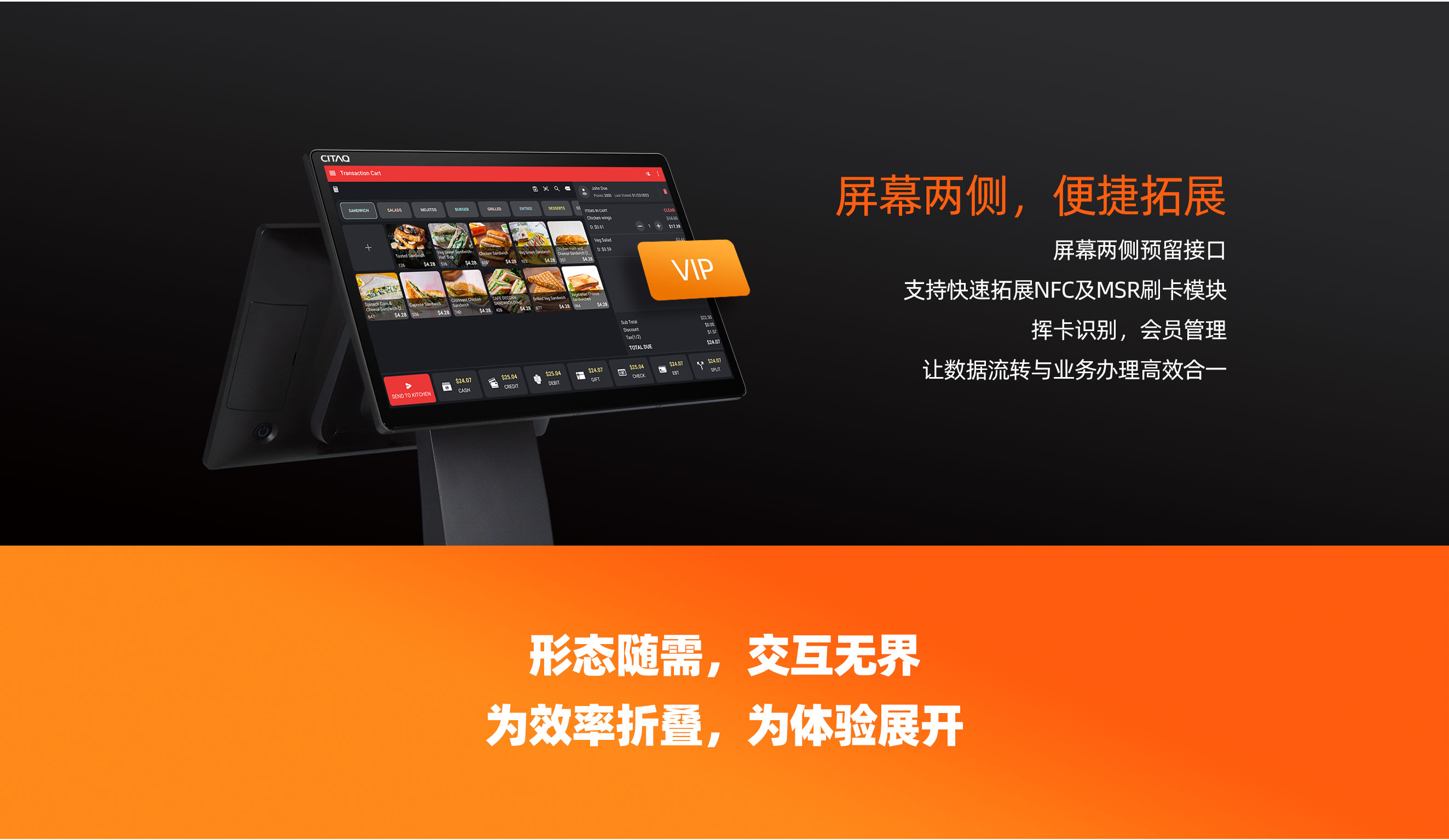T2w Lite 超薄桌面收银机,延续T2系列纤薄美学,以30mm轻盈机身重塑空间效率。配备15.6英寸7mm窄边大屏,支持单屏灵活折叠收合,适配空间多变场景。可选配双高清屏形态,机身预留丰富扩展接口,支持外接设备灵活拓展,为高效运营提供轻量而完整的智能收银解决方案。